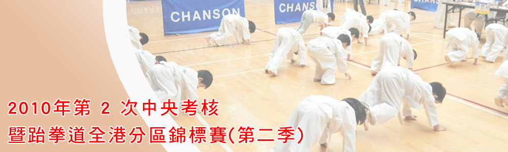 2010年第 2 次中央考核及暨跆拳道全港分區錦標賽(第二季)2010年8月29日中央考核 2010年第 2 次中央考核暨2010年至2011年跆拳道全港分區錦標賽日期: 2010年8月29日(星期日)時間: 上午11時至晚上7時地點: 大圍美林邨體育館(主場) 考核 比賽 Previous 文章 2010年第 2 次中央考核及暨跆拳道全港分區錦標賽(第二季) Next 文章 2010年9月5日比賽 – 裁判重溫班